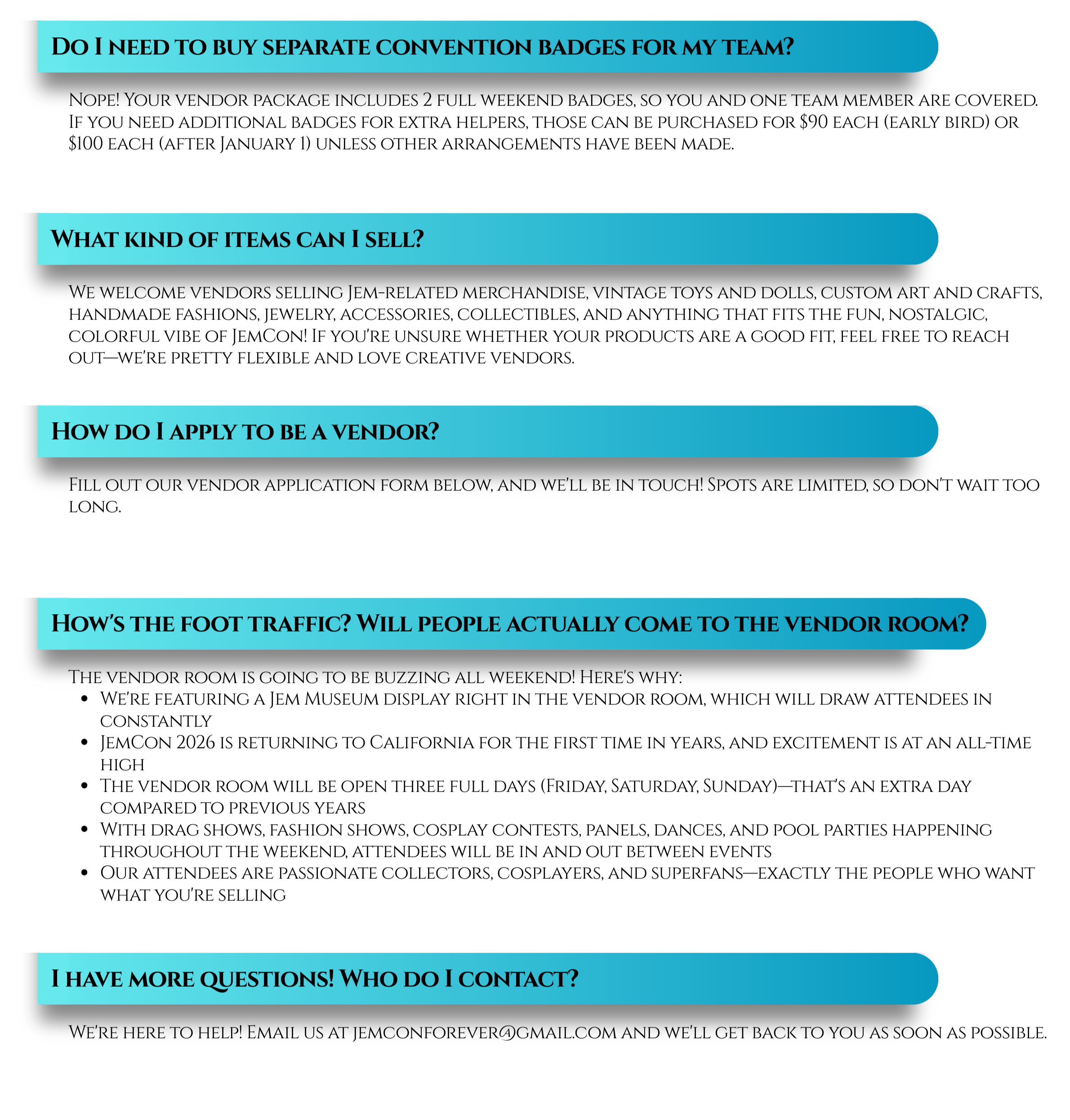 We're so pumped you're thinking about vending at JemCon 2026! Year after year, our attendees go absolutely feral for the vendor room—it's where they reconnect with their childhood, geek out with other fans, and snag some truly outrageous treasures to take home.